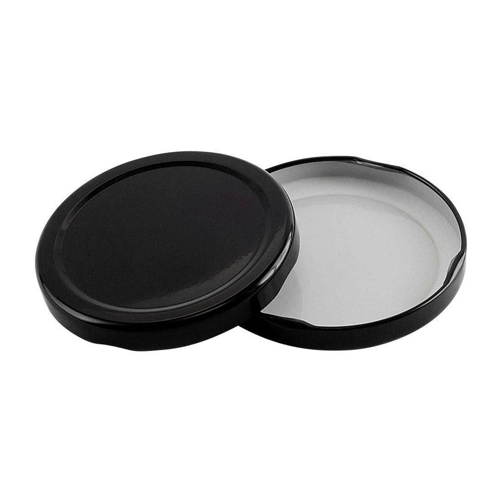 Applying a lug or twist-off cap requires a lid twist to grasp onto the jar's threads. This black 70mm lug cap fits jars with a 70/2030 finish.